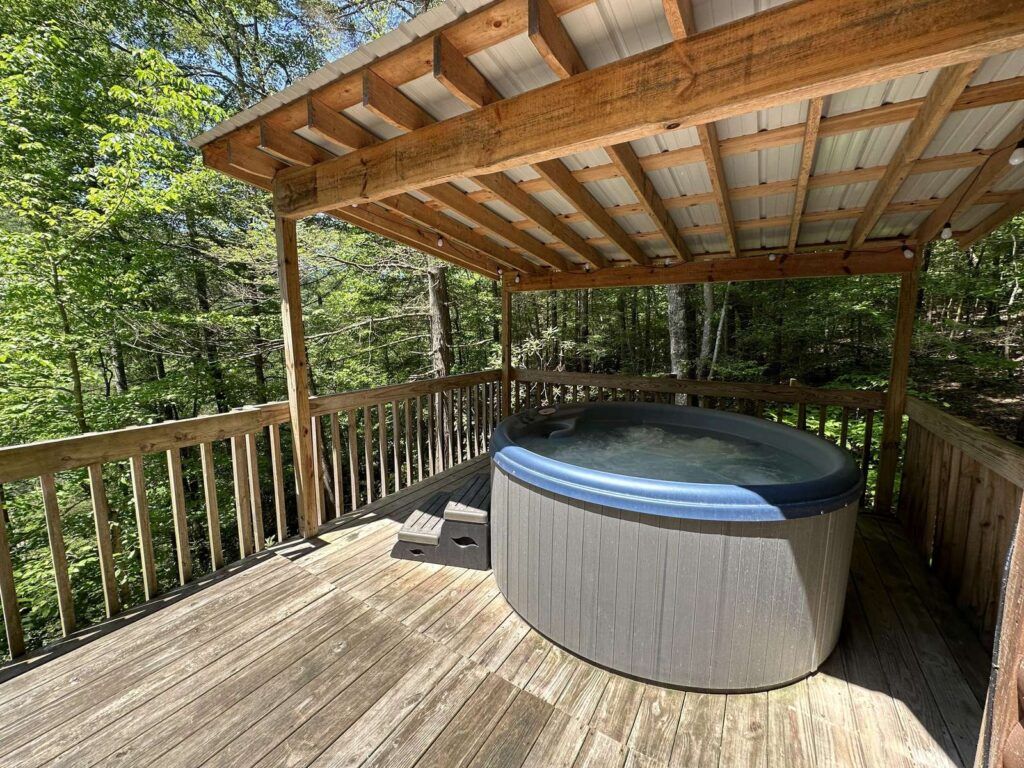 Surrounded by misty woods, this charming cabin features a cozy fireplace and hot tub and a peaceful ambiance for couples to unwind.