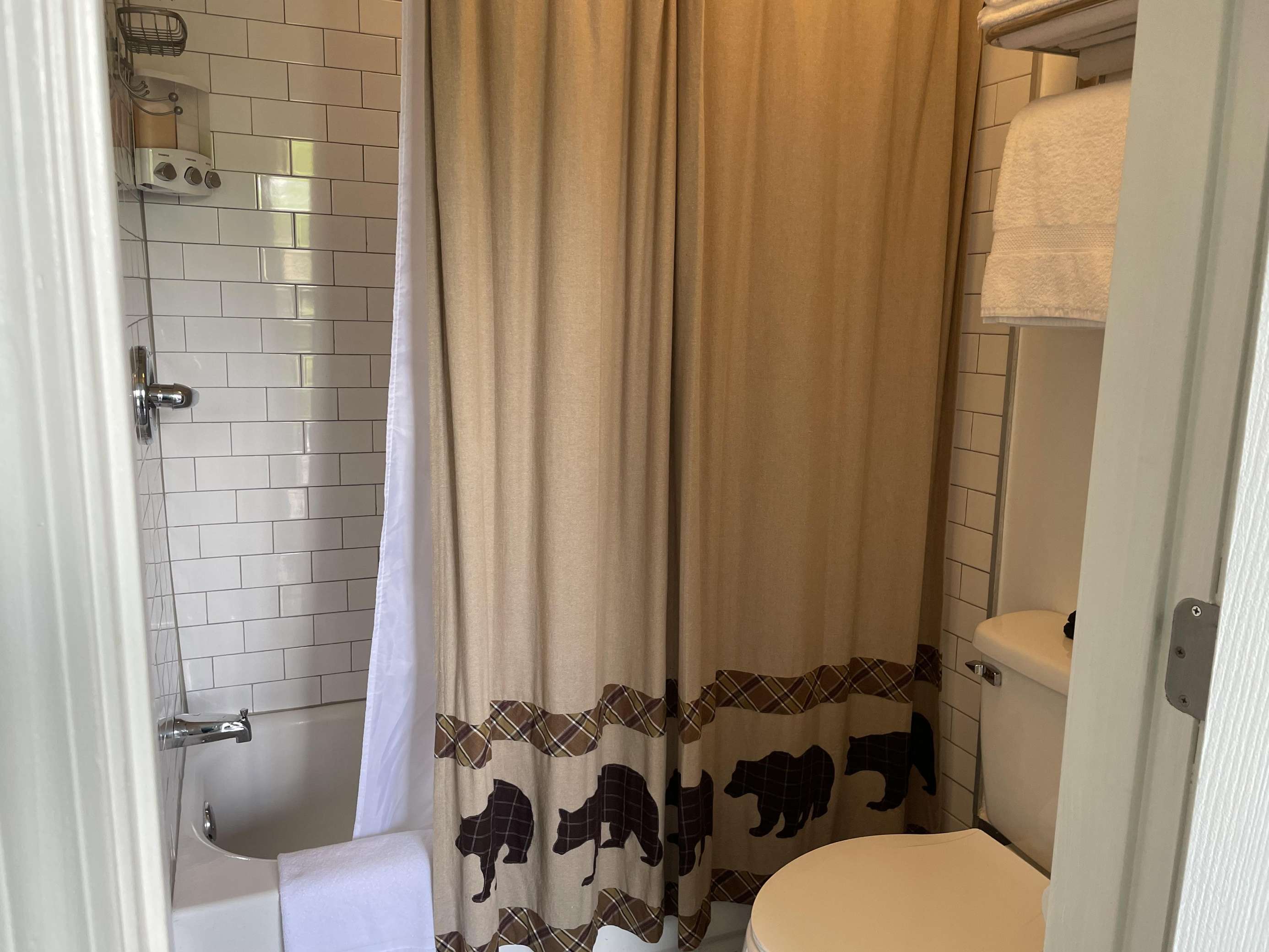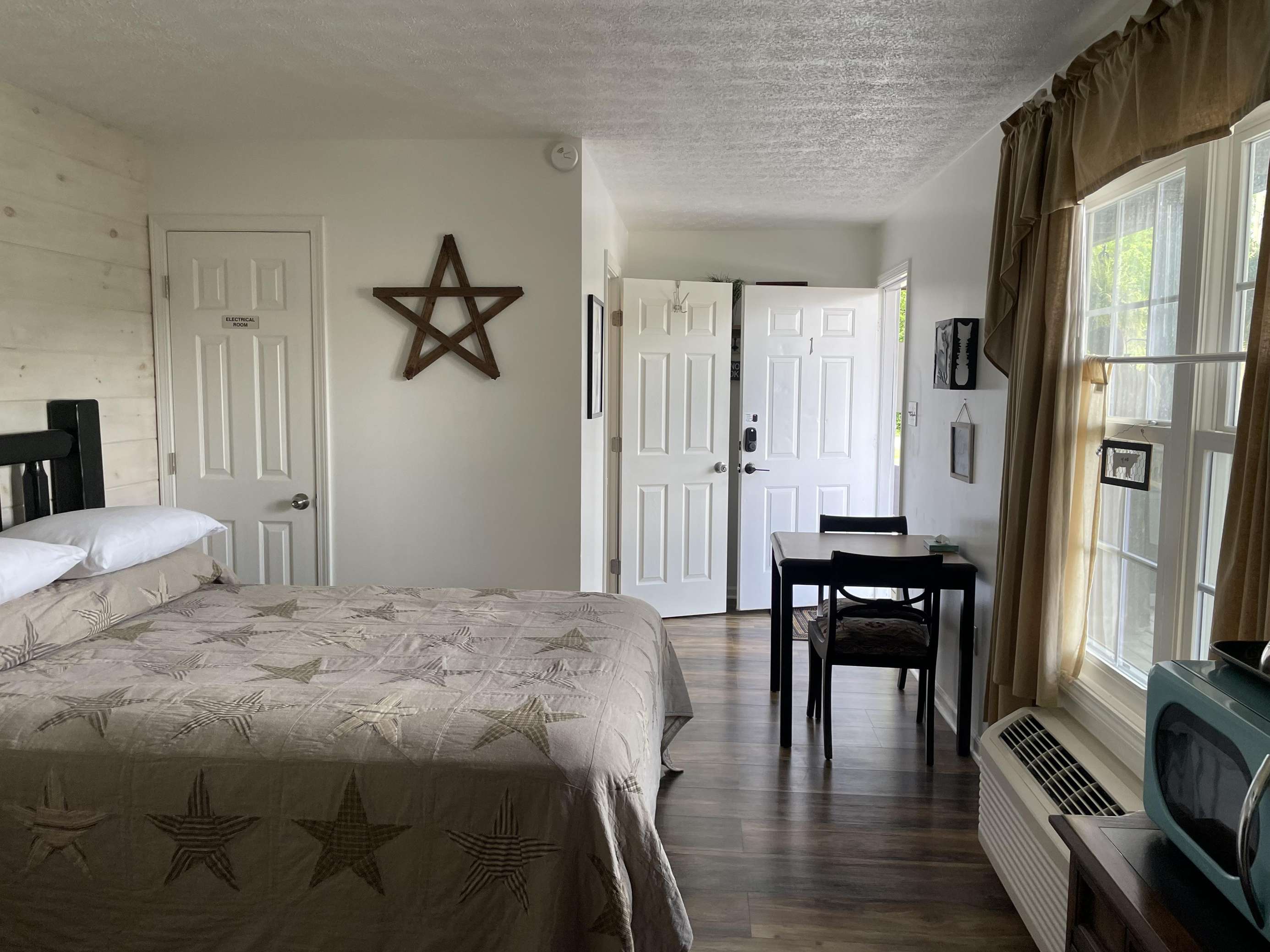 Rock Bridge Exploration is newly renovated and the property is under new management. The sleeping arrangements are 2 queen beds. There is wi-fi with a smart television. A workspace for eating or working is available along with a mini fridge and microwave. This room is upstairs facing the front and not handicap accessible. One flight of stairs to access the room.