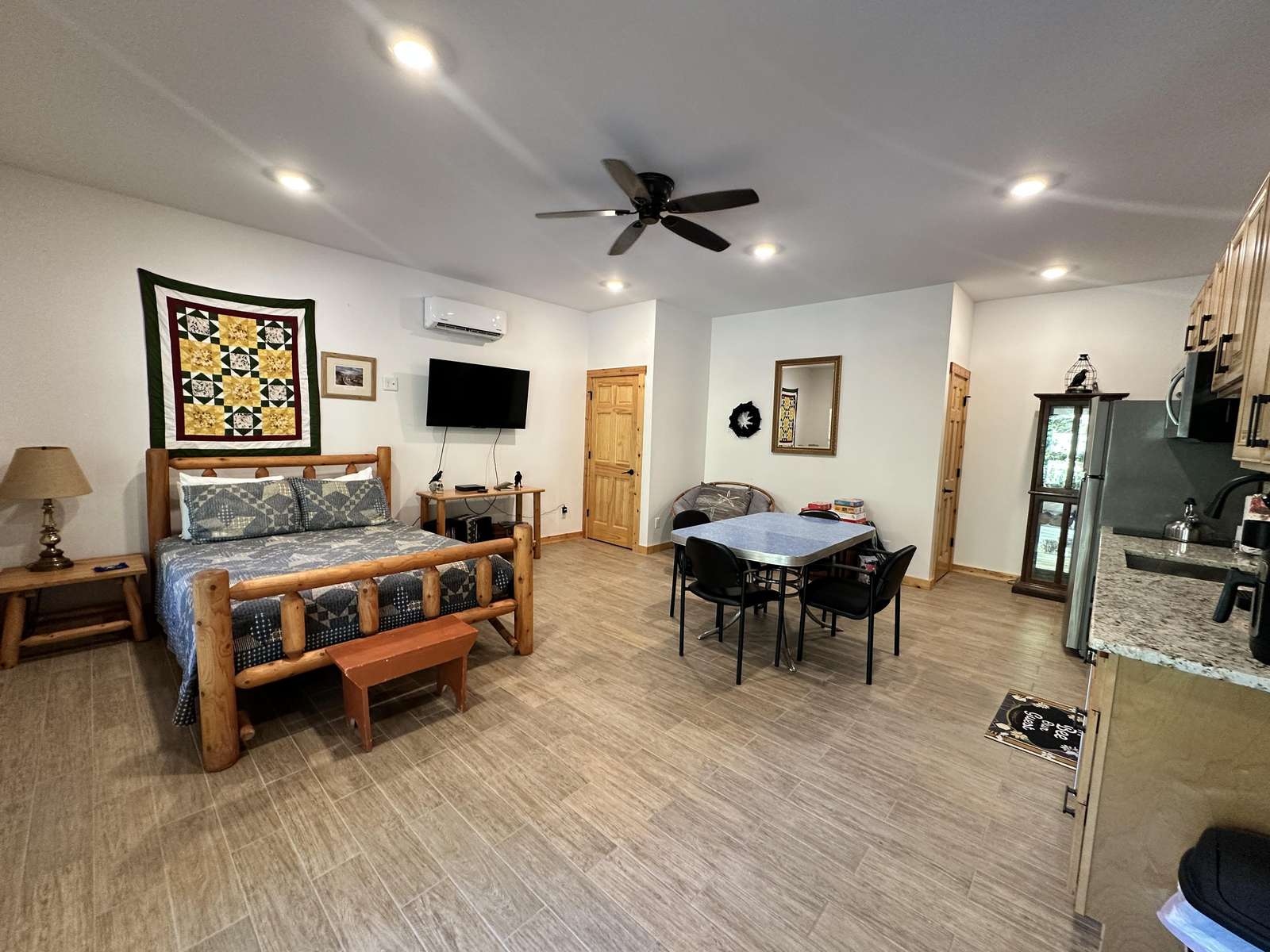 First floor - one queen bed and one twin day bed in an open floor plan style. There is a wheelchair accessible shower and toilet.