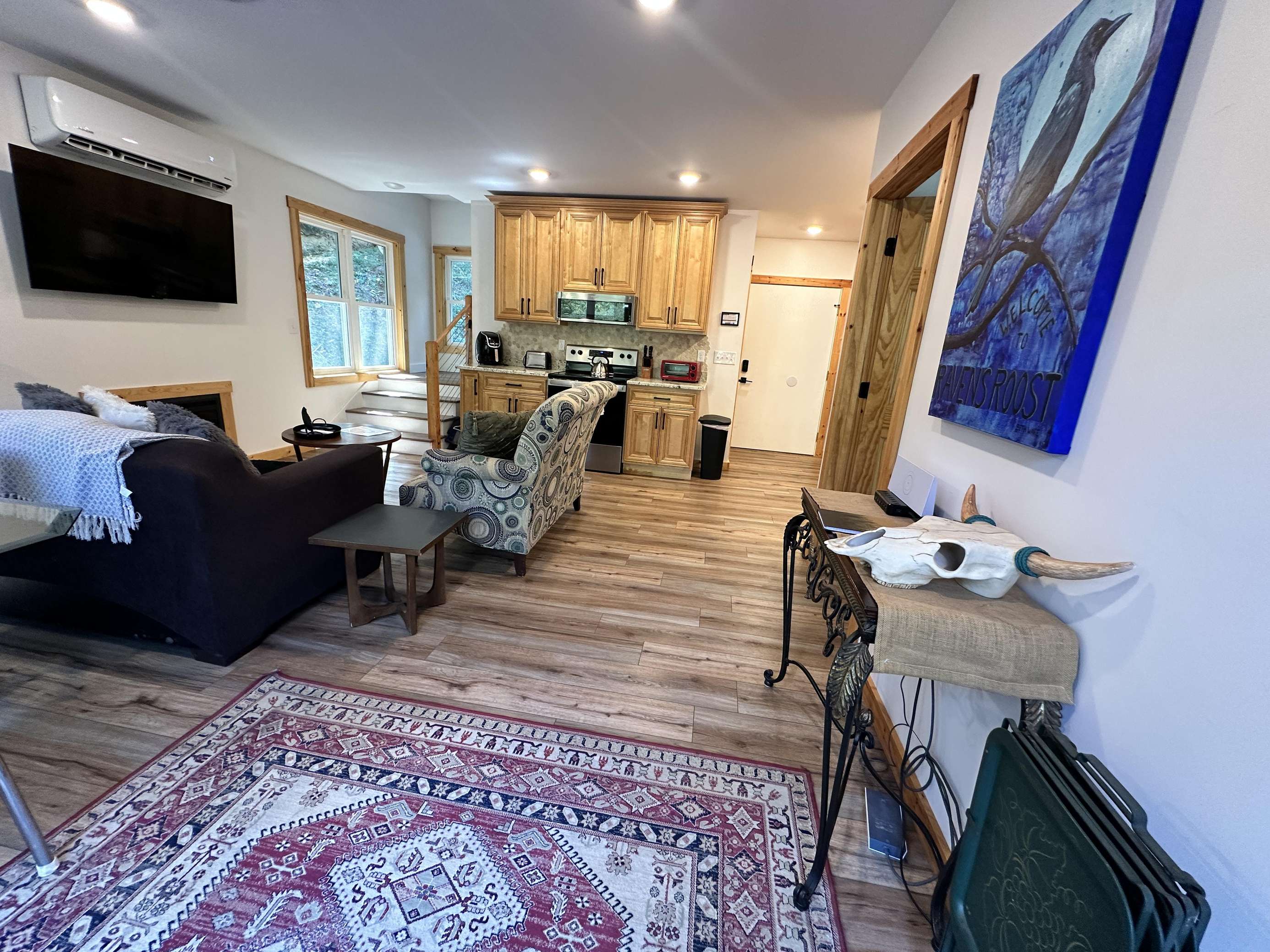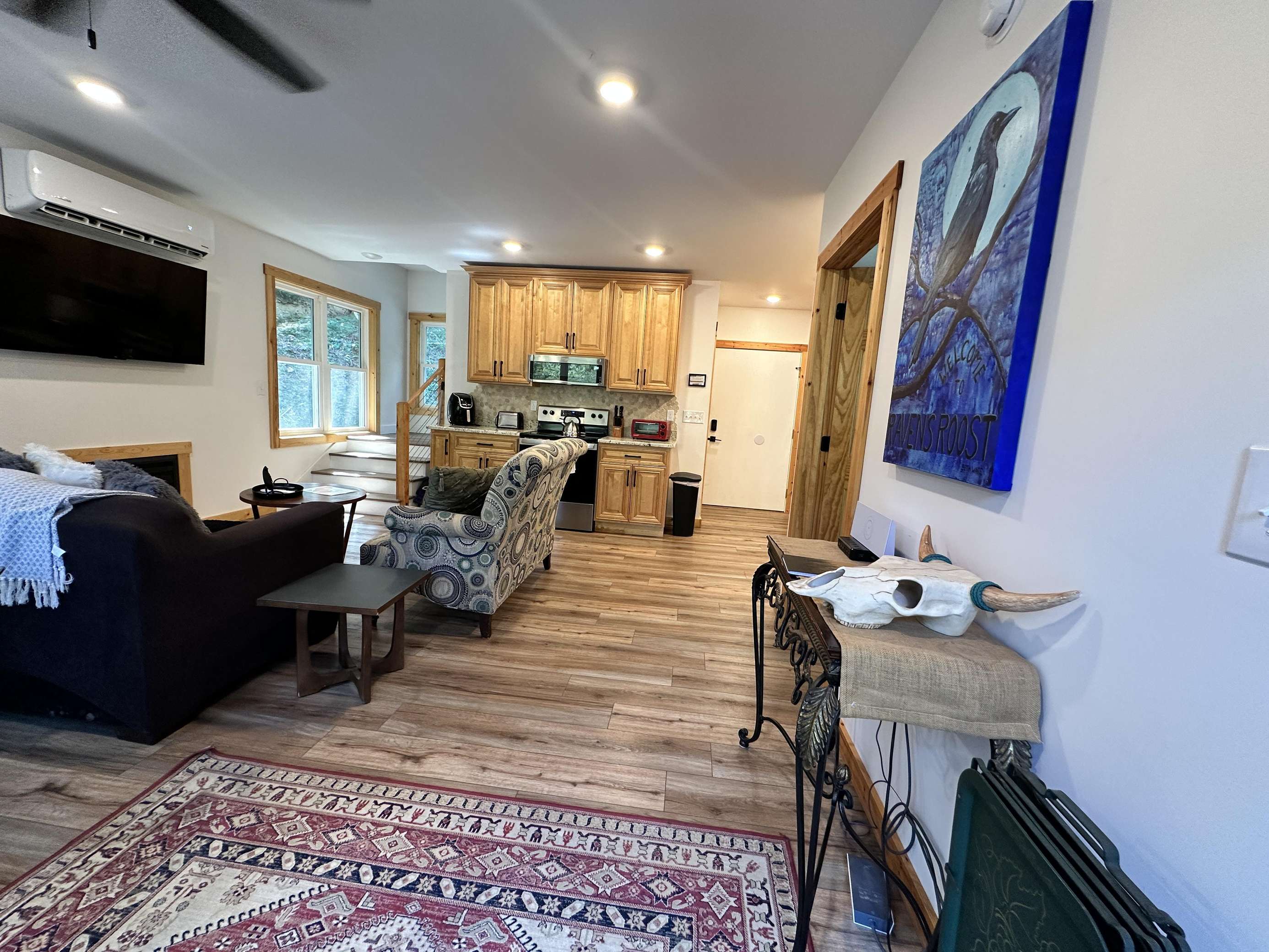 Raven's Roost is custom built on privately owned land within Red River Gorge, KY. It is in the middle of the "Gorge Loop" offering close access to all the hiking trails. A one of a kind with 4 sleeping areas, 2 kitchens, 3-bathroom cabin with large porches overlooking the woods is a great place for a large group or family to call home while down here exploring the beautiful Red. A truly unique find as it is wheelchair accessible. Sleeps 8 adults comfortably and room for 4 children. Starlink wi-fi. CHECK IN IS AT OUR OFFICE.