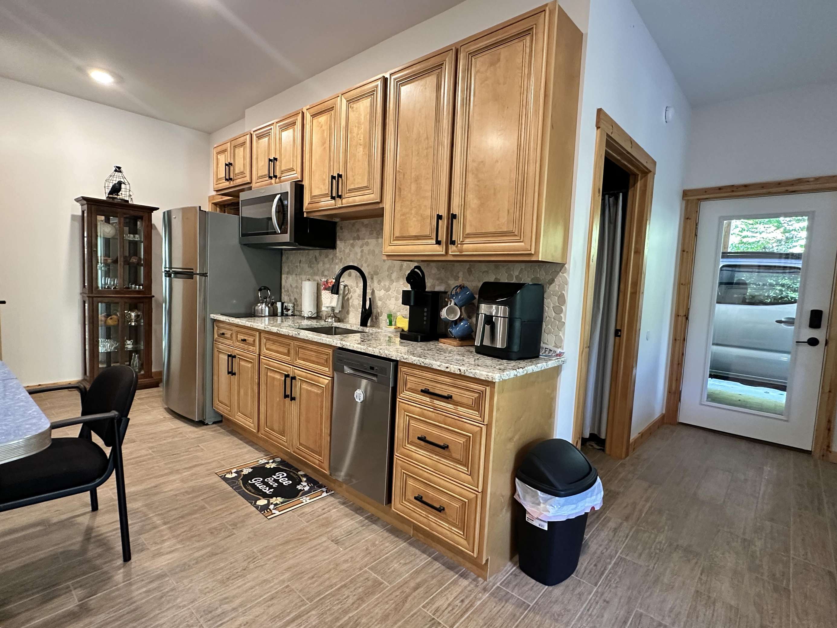 First Floor Kitchen: There are two kitchens (one on the first floor, one on the second). Both have Keurig coffee makers. The first floor has a two-burner hot plate, toaster, a full-sized refrigerator, a half-sized dishwasher and a microwave. Cookware, dishware, soap and kitchen linens are also provided.