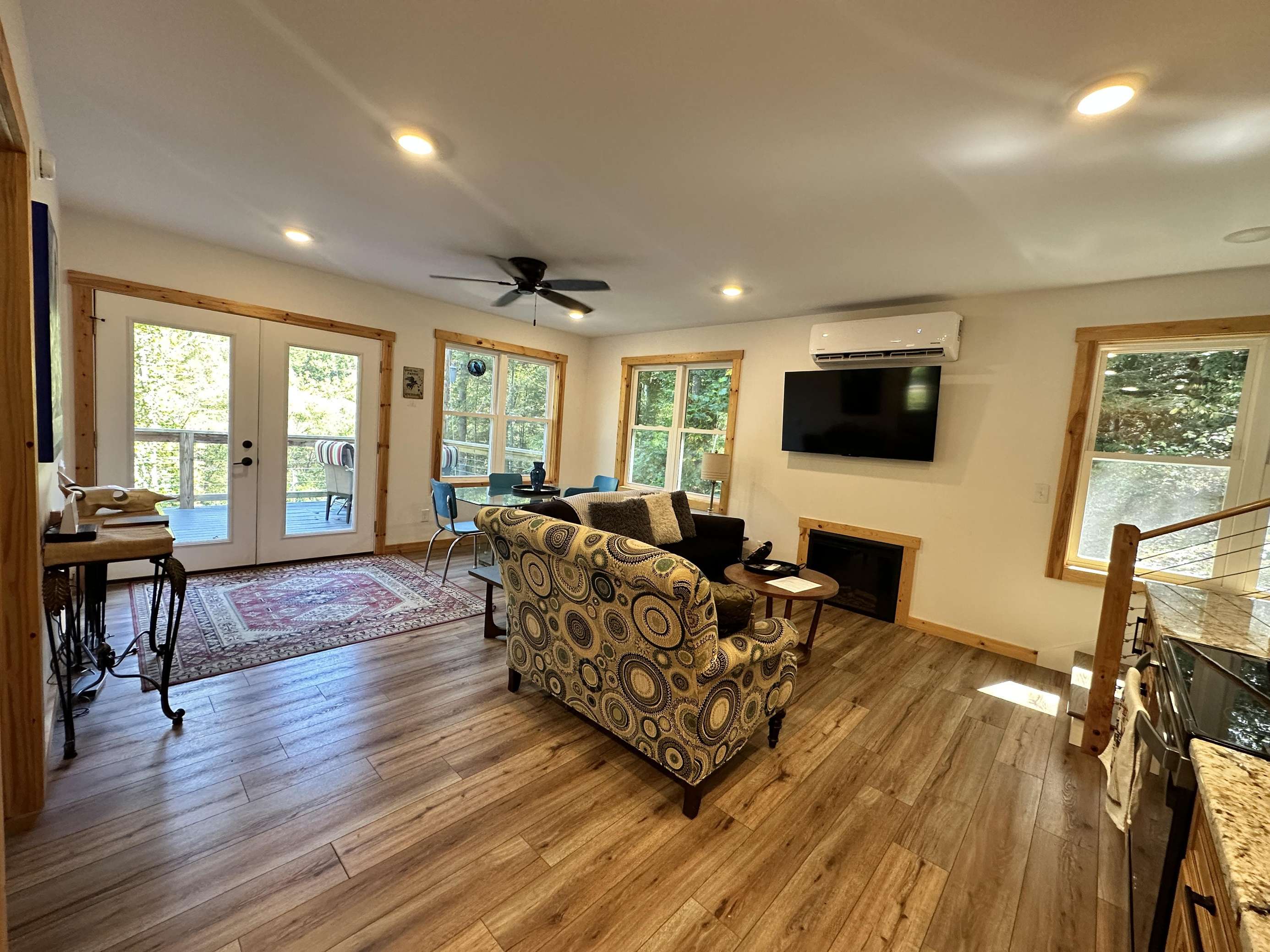 Living/Dining: The main room hosts a large kitchen table fit for six. There are lots of windows and a double door leading out onto the large deck.